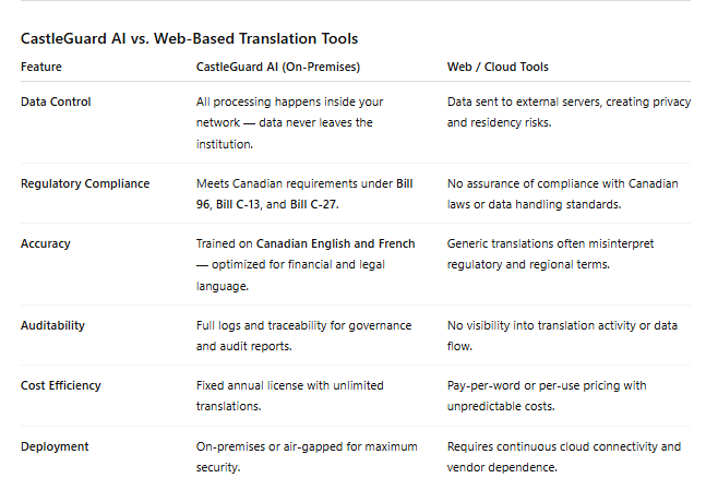 Translation in Canadian financial organizations is no longer just a workflow issue – it’s a matter of compliance, privacy and operational efficiency. CastleGuard AI enables banks to deliver translation services that meet legislative requirements, reduce costs, protect client data, and accelerate workflows. All while using AI tools built in Canada for Canadians.